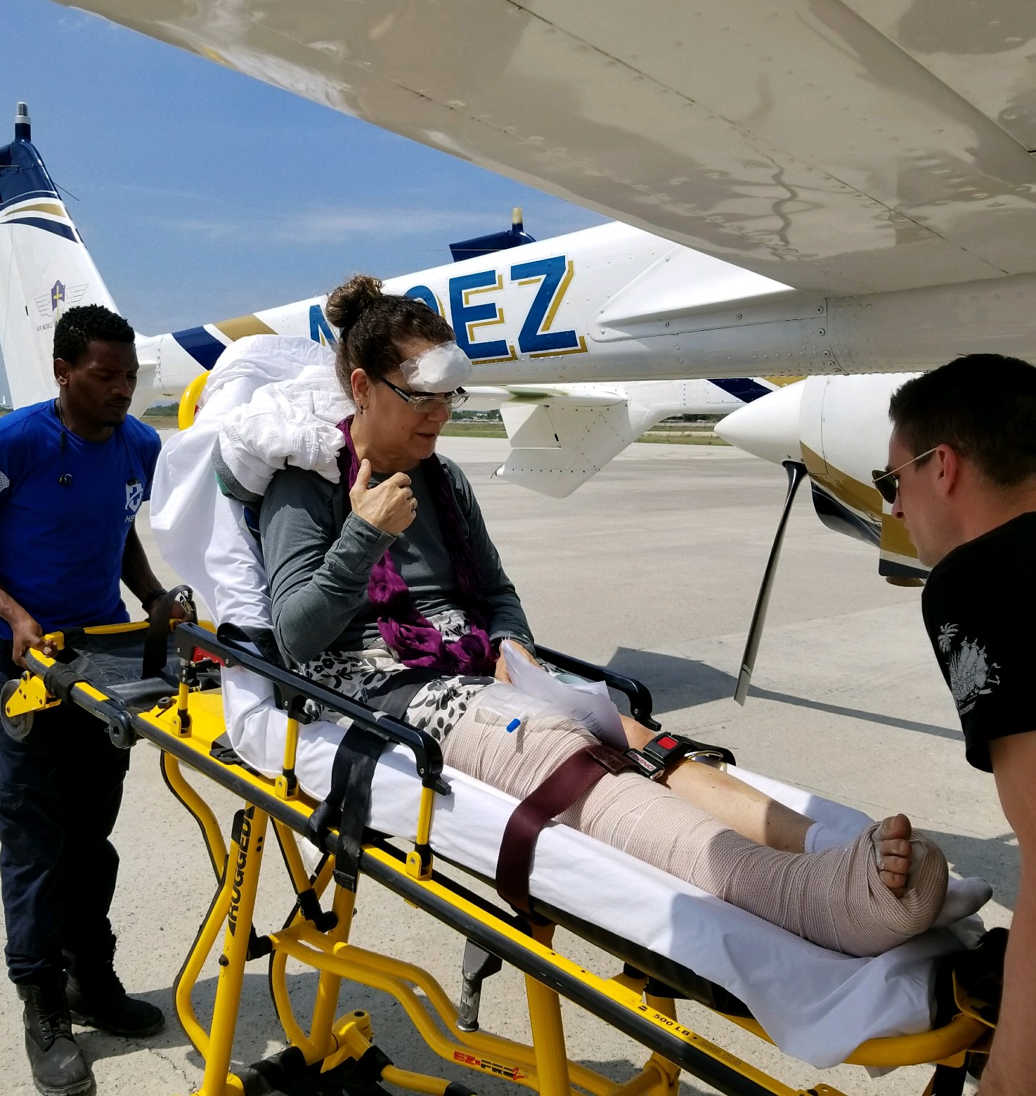 Annie’s injuries were much more serious than the broken leg and 4-inch gouge on her face. It turned out in addition to a fractured femur, she also had fractured her sternum, lumbar vertebra 3 top and bottom, and a rib. She was able to call her husband, who contacted the Plastic Ocean Project, which arranged an immediate evacuation of the team via Air Mobile Ministries. You can read more about the rescue on the blog of Joe, the pilot who received the call at 1:30 am on Monday and came to the rescue (Scroll almost to the bottom of the page to March 4).