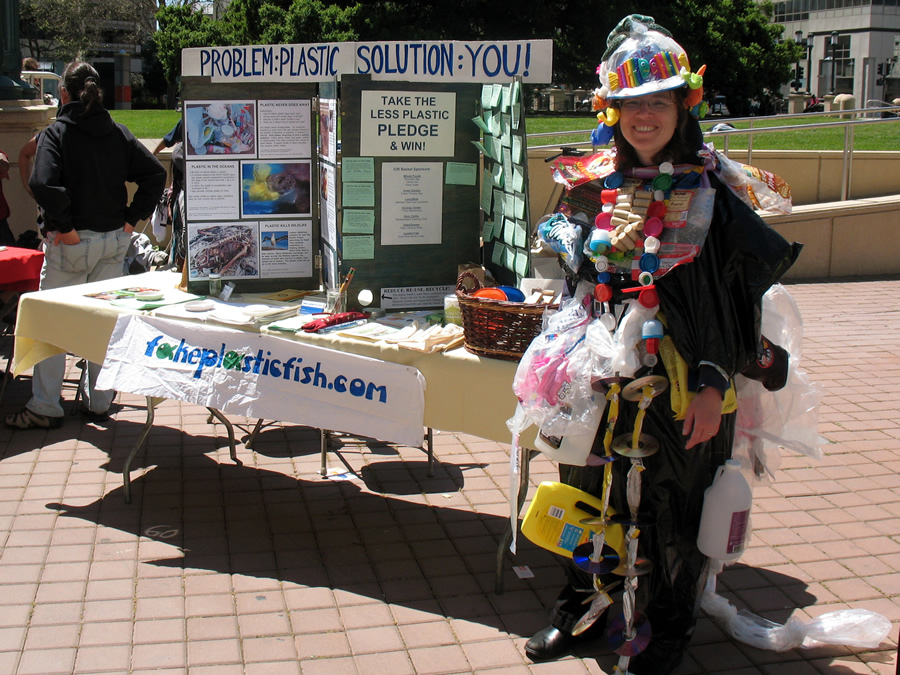 Beth's in sea monster costume booth at Oakland Earth Expo
